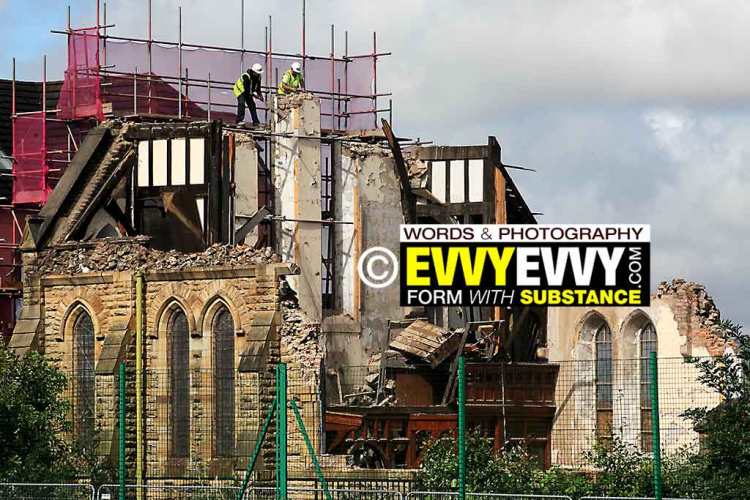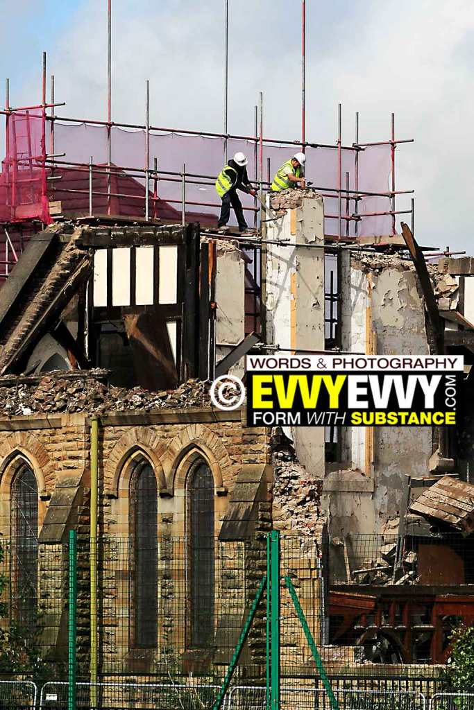 In reality—and of course for the right price—there aren’t many buildings that can’t be saved. But the once-proud church, no doubt erected partly as a middle finger to the Protestants down the road, in the days when Christian petty bigotry was still afoot (outside of you-know-where and you-know-where), was of little architectural value to the community at large without the adjoining school, which, if they’d been collectively restored, could’ve formed the cultural altarpiece of a Farnworth past no longer present.
