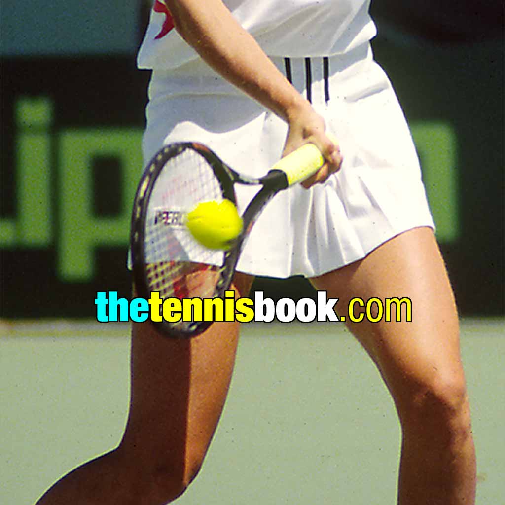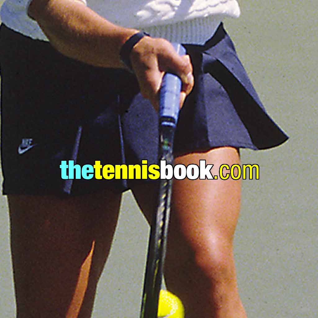 In contrast, Hana Mandlikova’s palm is – at best – behind the racket (though more on top), which puts some of her palm power behind the racket grip, though most of it stays above (or on top).