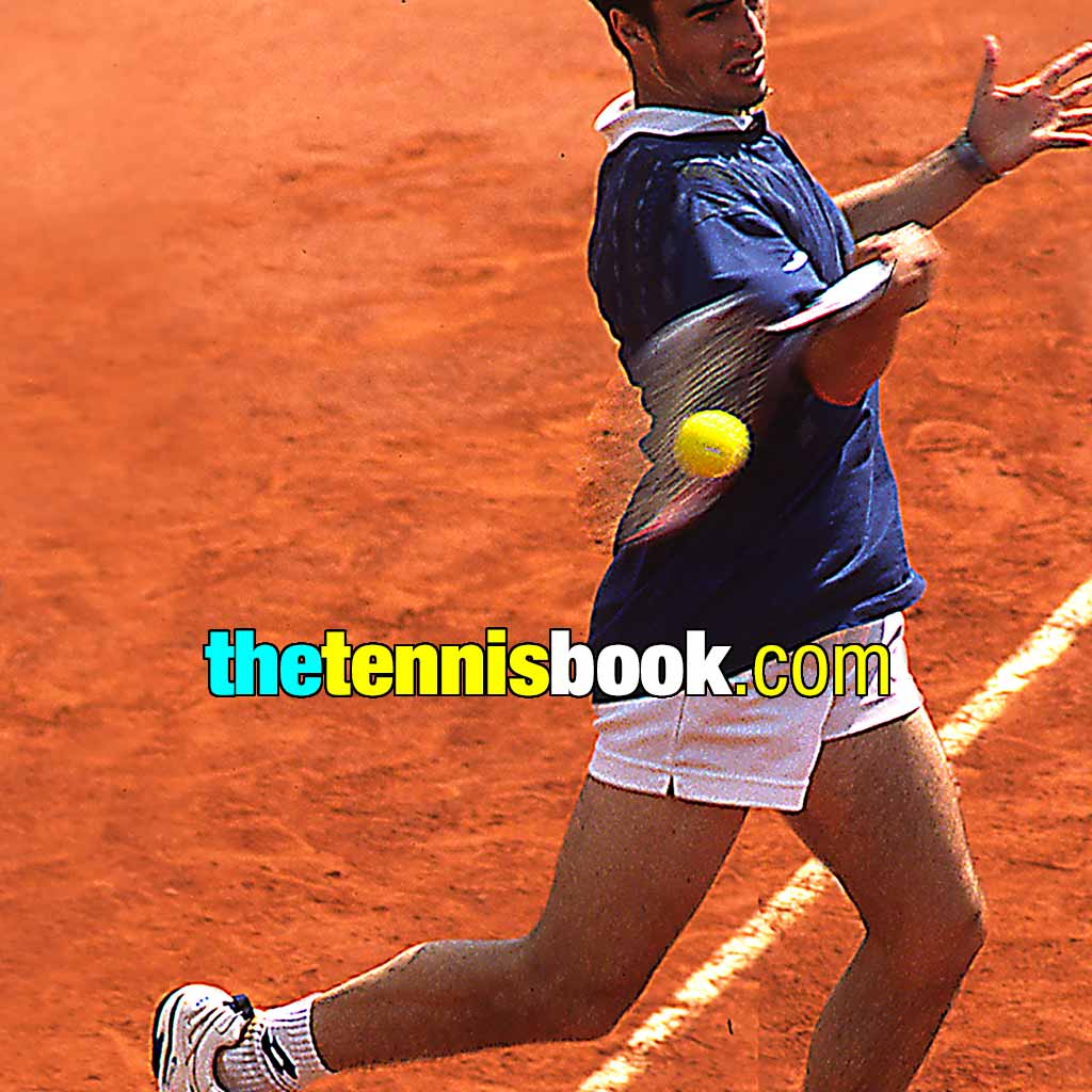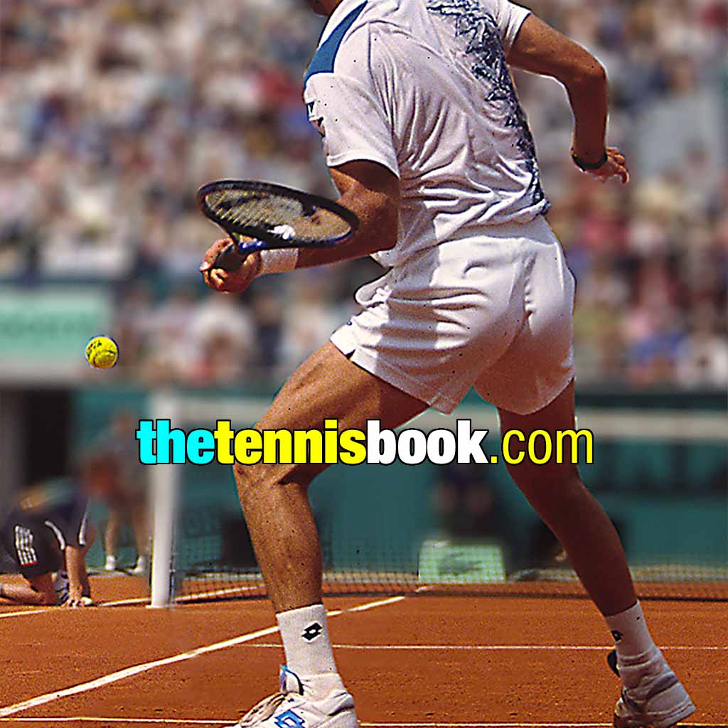 Michael Chang’s grip is in-between the two previously mentioned book ends, with the palm of his hitting hand both behind the grip and some way under it – just pause any of these slo-mo animations if you need to.
