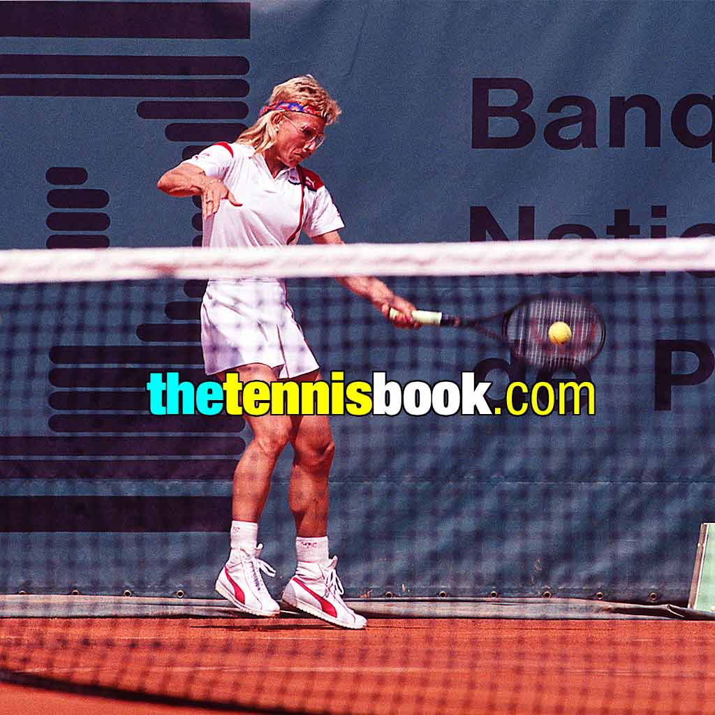 Connect 2: to avoid grazing your knees with the racket head, and other mini technical catastrophes, the ball should be out to the side of your body like Martina (below).