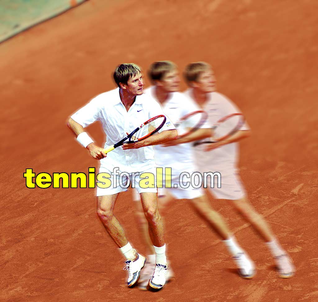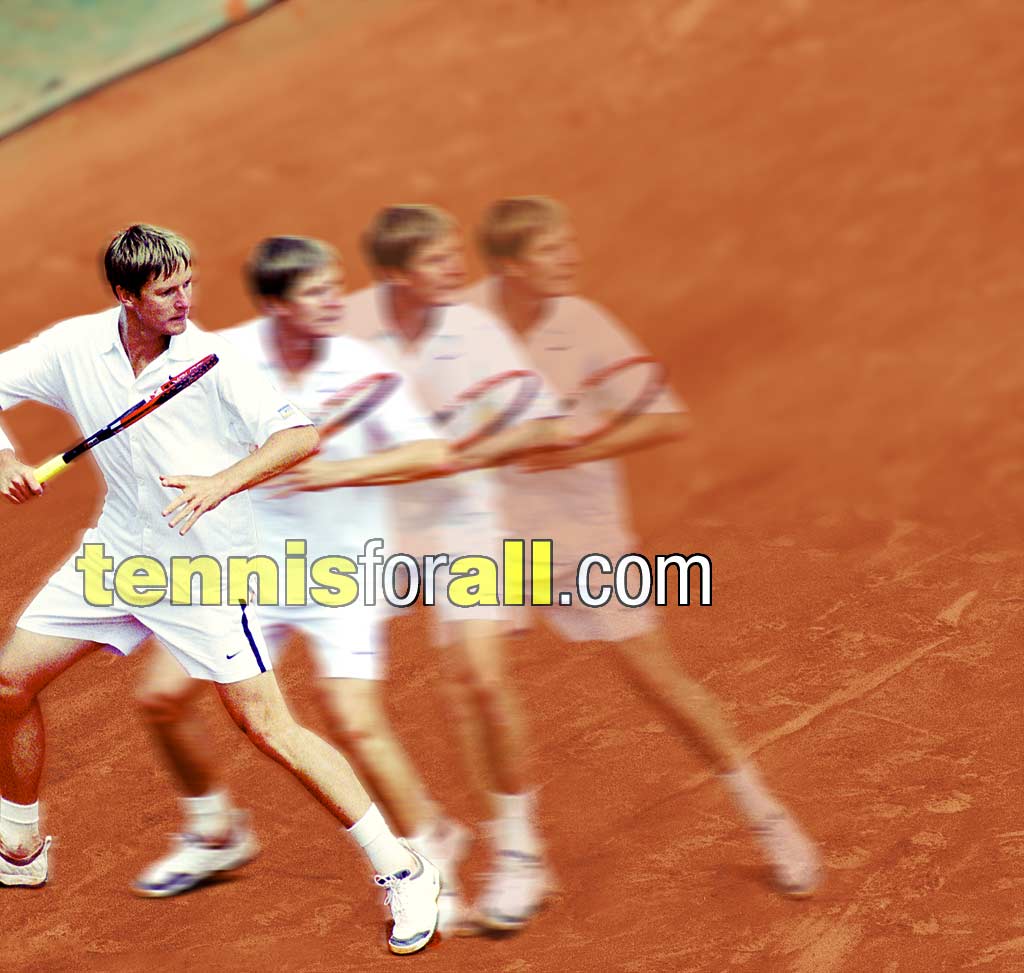 But he chooses not to – instead, Kafelnikov reads the flight of the oncoming ball and reacts with a shove of his left foot, which starts his backward shift.