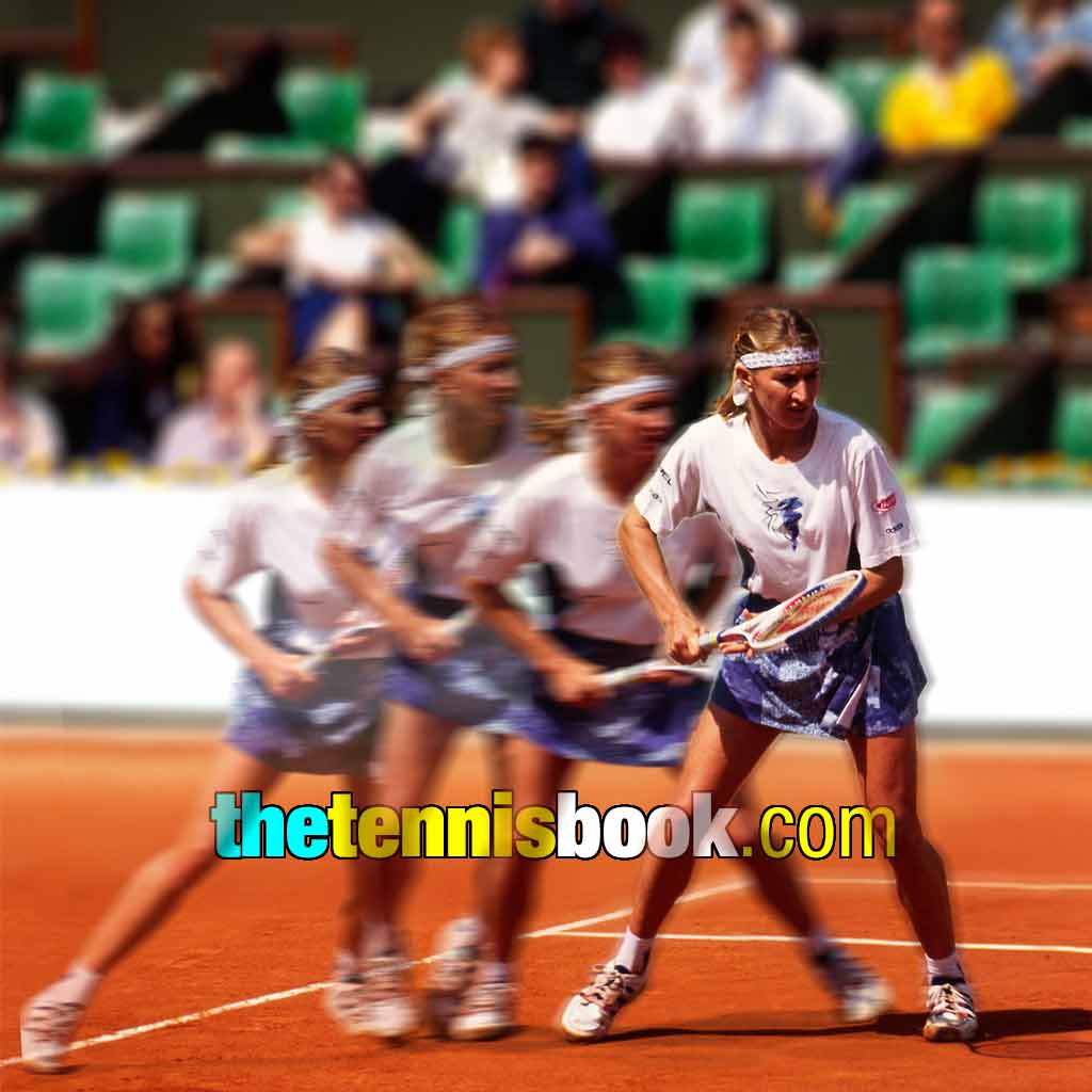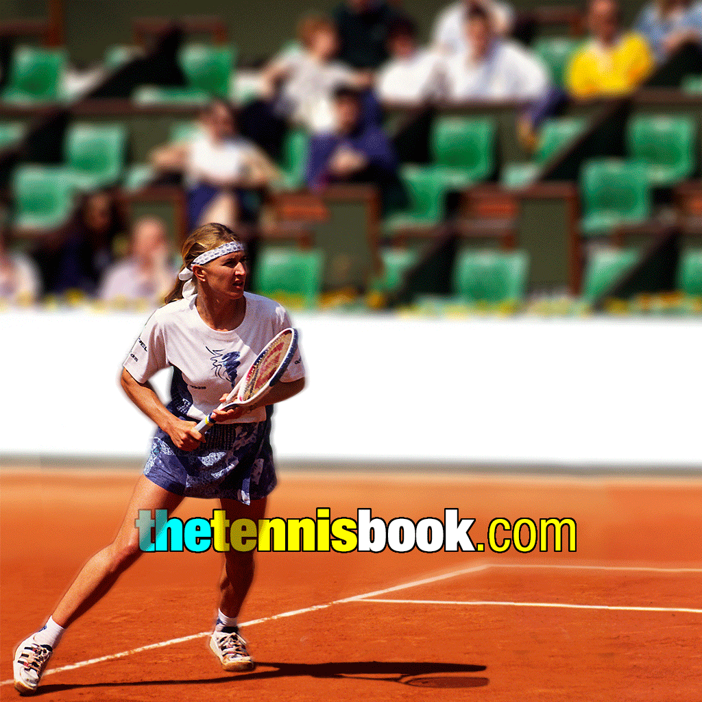 Not only has Steffi read that the ball is going to bounce short, but she also works out the ball’s traveling line:- if she’s going to hit a good forehand, she needs to move beyond this line (otherwise she’ll be too close to the ball).